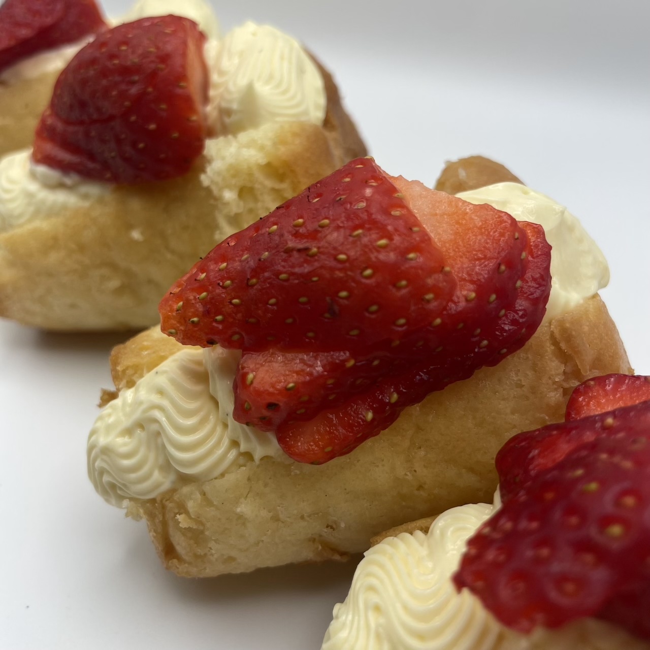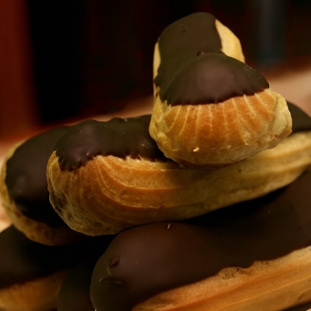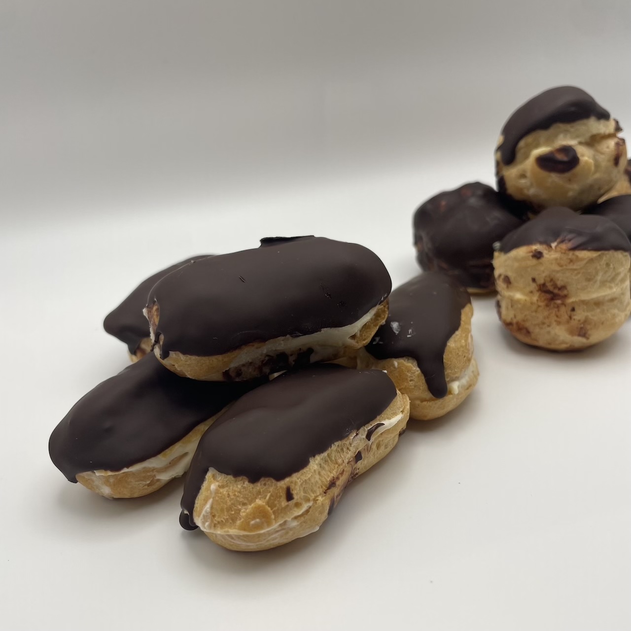 Our éclairs and profiteroles, made with authentic choux pastry, are filled with a smooth, velvety chocolate cremeux and finished with a glossy dark chocolate for the perfect bite every time.